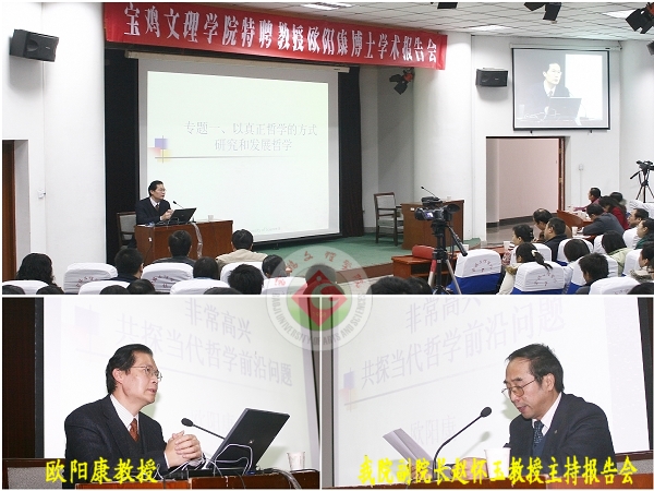 此次报告,欧阳教授以“当代哲学的前沿问题”为题目,结合时代与哲学发展的方向,分别从“以真正哲学的方式研究和发展哲学、马克思主义哲学的中国化问题、马克思主义哲学的当代价值和当代形态、马克思现代性批判的价值取向及其当代意义、全球化与马克思主义哲学的当代发展”等五个方面做了详尽的阐述,对当代哲学发展过程中存在的问题进行了深入的分析,对一些哲学大师的经典思想做了精妙的点评。欧阳教授以其温文尔雅的风度,谦逊幽默的谈吐,精辟独到的见解,深厚丰富的学术修养赢得了师生的一致好评,会场掌声连连,笑声不断。最后,赵副院长对欧阳教授的报告做了精妙点评。此次报告起点高、跨度大、含义深、观点新,增强了同学们对哲学学习研究的兴趣,促使同学们学会在思考中生活,在生活中思考。(哲学系供稿)