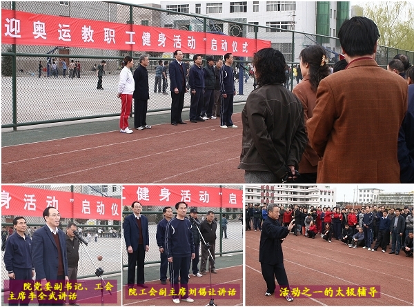 3月21日下午,院工会在老校区体育场举行“迎奥运教职工全民健身活动”启动仪式。院体育运动委员会副主任张天祥教授,太极拳教练李慎行教授、张天熙教授、马云慧副教授和来自各分会的200余名教职工代表参加了启动仪式。院党委副书记、工会主席李全武出席启动仪式并作重要讲话。启动仪式由院工会副主席刘锡让主持。