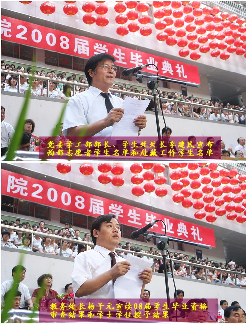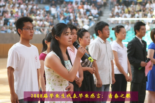 化学化工系杨德锁博士代表全体教师对毕业生圆满完成大学学业表示热烈祝贺。地理科学与环境工程系2004级环境工程专业毕业生杨晓芸代表全体毕业生向辛勤工作、勤于奉献的老师们表示衷心的感谢,在今后工作岗位上发扬文理精神,牢记“博文、明理、厚德、尚能”的校训,为母校增光添彩。政法系2006级思想政治教育专业学生秦娇代表全体在校生衷心祝愿2008届毕业生事业有成,前程似锦。