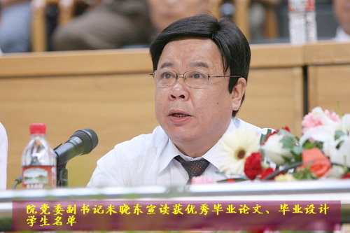 毕业典礼在雄壮的国歌声中正式开始。院党委书记赵怀礼给西部志愿者学生和赴藏工作学生颁发了奖金;学位委员会主席、院长王志刚博士向毕业生代表颁发了毕业证书和学位证书;院党委副书记米晓东宣读了获优秀毕业论文、毕业设计、毕业创作名单;教务处长杨子元宣读了2008届学生毕业资格审查结果和学士学位授予结果;学生处处长李建民宣布西部志愿者学生名单和赴藏工作学生名单。