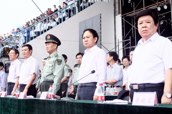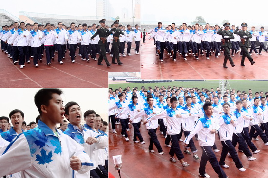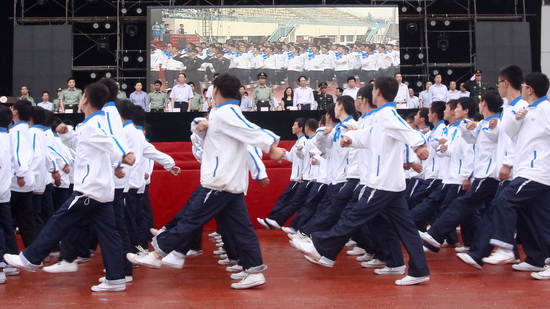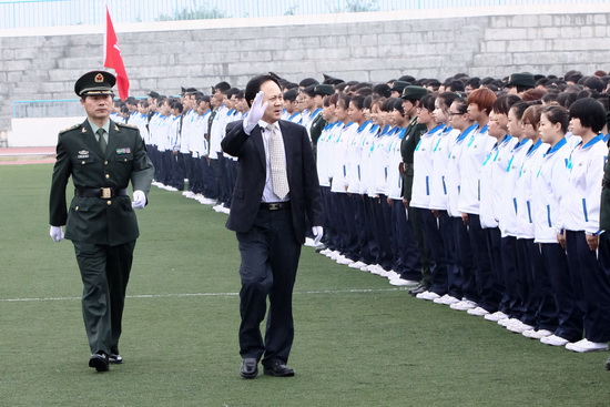 王志刚在陈忠述的陪同下,检阅了全体受训学生。随着雄壮的解放军进行曲响起,各院系列队经过主席台,同学们精神饱满、步伐整齐、口号响亮,激起阵阵掌声。