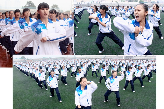 分列式结束后,分别由2013级新生组成的男子擒拿格斗、女子军体拳表演队进行了汇报表演。他们以昂扬的斗志、整齐划一的动作、霹雳勇猛之势,赢得了部队首长和学校领导的高度称赞,随着女子军体拳表演队“祝首长身体健康、中秋快乐”的一声问候,把整个汇报表演推向了高潮。