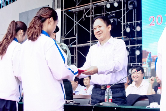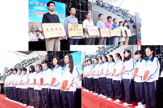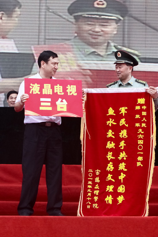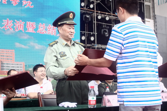 汇报表演结束后,白黎向96401部队赠送了锦旗和礼品。学工部部长李周让宣读了军训领导小组对军训工作先进单位和军训标兵的表彰决定。校领导和部队首长为受表彰的单位和个人颁发了奖牌和证书。