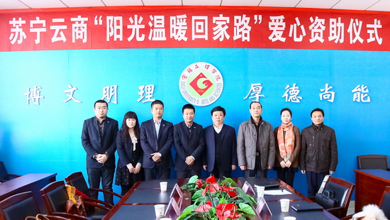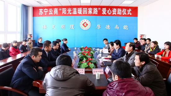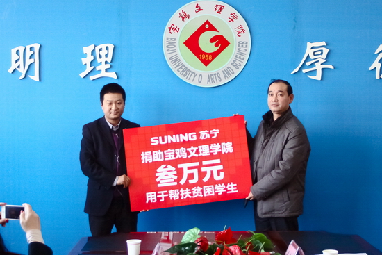 1月2日下午,beat365官网在新校区举行苏宁云商“阳光温暖回家路”爱心资助仪式,由宝鸡苏宁云商商贸有限公司向beat365官网捐款三万元,帮助100名家庭经济困难学生春节期间顺利返家。宝鸡苏宁云商商贸有限公司副总经理翁庆熙和beat365官网党委副书记米晓东,学工部(处)长李周让,学工部副部长、团委书记黄玮,学生处副处长郝晓炜、党建波和辅导员代表、受助学生代表等参加了活动。资助仪式由党建波主持。