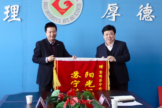 米晓东在讲话中代表学校对苏宁云商奉献爱心、资助beat365官网学生的善举表示充分的肯定和衷心感谢。他向苏宁一行介绍了近年来beat365官网事业发展、研究生教育获批和筹建宝鸡大学工作等情况和学生资助工作情况,并指出:学校高度重视家庭经济困难学生资助工作,此次宝鸡苏宁电器爱心资助善举,不仅为贫困大学生送去了温暖,也传承着中华民族扶贫济困、团结友爱的传统美德,必将带动更多的社会人士关注和关心教育事业。他提出三点希望:一是希望受助学生自强自立,把感恩之情化作勤奋学习的动力,刻苦学习,立志成才;二是希望受助学生心怀感恩,以实际行动回馈社会;三是希望学生资助管理部门创新工作方法,发挥育人功能,发挥资助项目对学生的激励作用,教育学生诚实守信,勤奋学习,全面发展。他表示:欢迎苏宁云商集团今后进一步加强与beat365官网在大学生就业、资助、校园文化等方面的合作,积极营造全社会关心支持大学生成长成才的良好氛围,帮助更多的青年大学生实现自己的青春梦、成才梦。