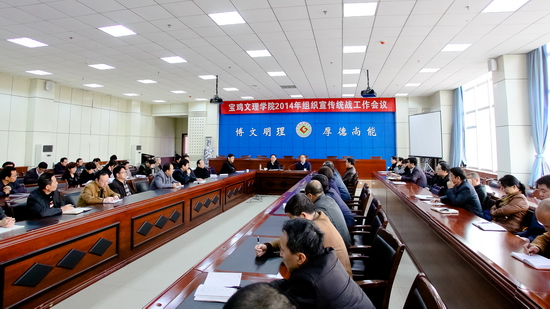 3月20日下午,学校在新校区甘棠厅召开2014年组织宣传统战工作会议,安排部署2014年组织、宣传和统战工作。校党委书记王志刚作讲话,校党委副书记李全武主持会议。各单位党政主要负责人,各党总支副书记,组织部、宣传部全体人员参加了会议。