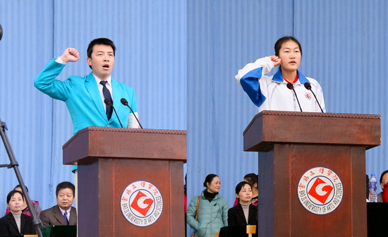 裁判员代表体育系教师魏延和运动员代表历史文化与旅游系杨楠同学分别向大会庄严宣誓。