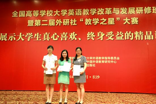 “全国高等学校大学英语教学改革与发展研修班”暨第二届外研社“教学之星”大赛于7月18日到21日在湖南长沙举行。来自全国各高校的300多位教师参加本次研修,其中33位大学英语教师以“微课”的形式进行比赛,以此展示个人教学风采,和同行切磋,与专家交流。beat365官网由外国语言文学系副主任姚艳梅带队指导,有6名教师参加了本次研修班,其中外国语言文学系教师卫蕾参加“教学之星”微课大赛。
