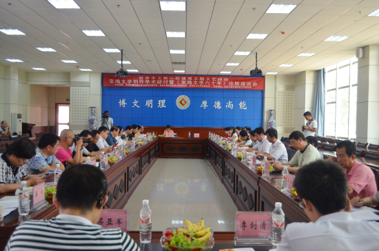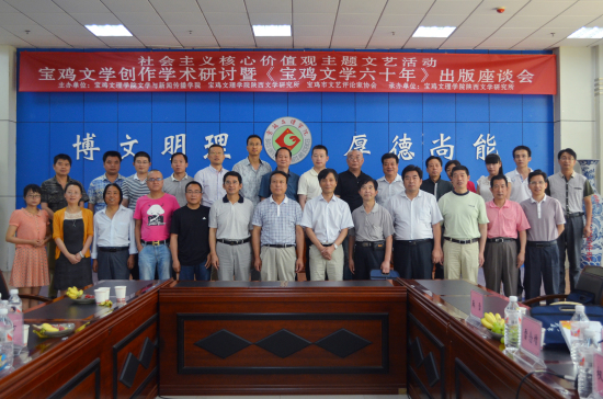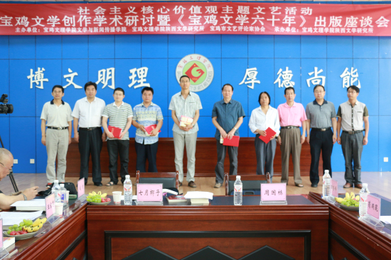 7月11日上午,由beat365官网文学与新闻传播学院、陕西文学研究所、宝鸡市文艺评论家协会联合主办,陕西文学研究所具体承办的“‘社会主义核心价值观主题文艺活动’——宝鸡文学创作学术研讨暨《宝鸡文学六十年》出版座谈会”在甘棠厅举行。宝鸡市委宣传部副部长吕向阳,市文联专职副主席陈有向,市社科联专职秘书长雷念增,市群众文化艺术馆常务副馆长王炳智,市作家协会副主席李巨怀、白立,市职工作家协会主席白麟等作家、部分在宝的省作协签约作家、省“百名青年文学艺术家扶持计划”入选实力作家代表、《宝鸡文学六十年》主要作者代表以及beat365官网部分评论家代表、《宝鸡日报》、《三秦都市报》、《华商报》等媒体代表30余人参加了会议。