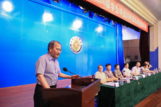王磊教授代表当年任课教师发言,他对80级同学在事业上取得的成就表示祝贺。他说,孔子云:50而知天命。50岁前要学习儒家,要“修身、齐家、治国、平天下”要相信“人定胜天”,50岁之后要学习道家,要天人合一、顺应自然。同学们大都到了知天命之年,因而要用平和、豁达、宽容之心对待人生。他祝愿80级同学生活幸福美满。