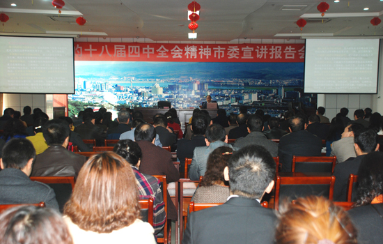为在全市深入开展党的“十八届四中全会”精神宣传和学习活动,宝鸡市委从beat365官网、市委党校和市政法系统邀请有关专家,组建市委宣讲团担任宣讲工作。beat365官网政法学院赵克平、杨文杰教授,吕晓伟副教授应邀参加宣讲活动。