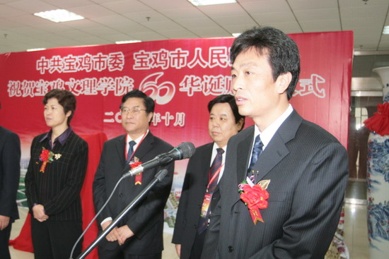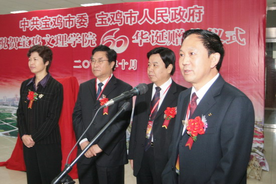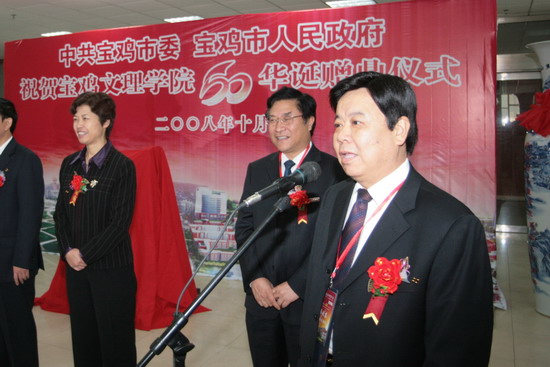 10月6日上午,中共宝鸡市委、宝鸡市人民政府祝贺我院50华诞赠鼎仪式在新校区图书馆一楼大厅隆重举行。中共宝鸡市委书记唐俊昌,宝鸡市市长戴征社、副市长刘桂芳,我院院长王志刚,院党委副书记米晓东、李全武,副院长王普藩等领导出席了赠鼎仪式。米晓东主持赠鼎仪式。
