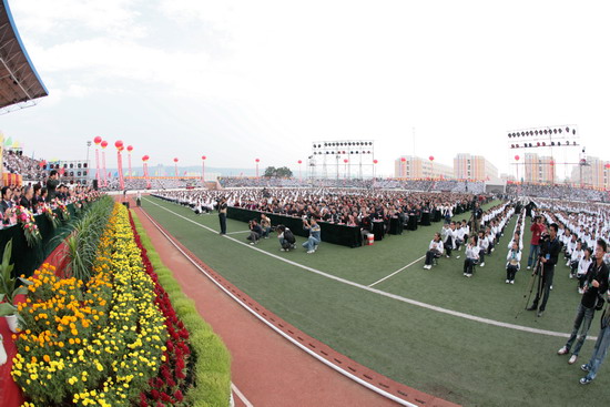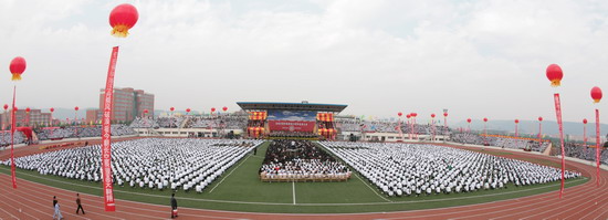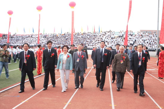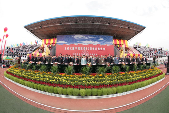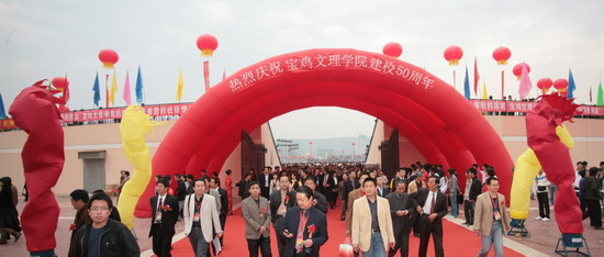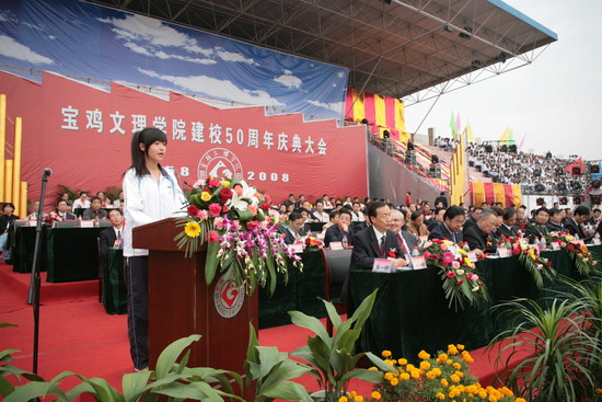 上午10:00,建校50周年庆典大会在新校区体育场隆重举行。庆典大会由我院党委书记赵怀礼主持,出席庆典大会的领导和来宾有:陕西省人民政府副省长朱静芝,原陕西省政协主席周雅光,原国家教育部副部长、中国高教学会会长周远清,原陕西省政协副主席苏明,陕西省教育厅厅长杨希文,中共宝鸡市市委书记唐俊昌,宝鸡市人民政府市长戴征社,陕西省人民政府办公厅副巡视员徐春华,陕西省财政厅副厅长丁云祥,中国工程院院士、长安大学博士生导师、我院兼职教授李佩成,中国人民解放军96401部队副政委万中山,我院校友、中共中央办公厅研究员杜省权,我院校友、国家林业总局驻海口专员程鹏,陕西省学位委员会秘书长孙朝,我院校友、宝鸡市人民政府副市长刘桂芳,陕西省教育工会常务副主席张敏,陕西省社科联主席赵馥洁教授,陕西师范大学校长 、博士生导师房喻教授,首都师范大学副校长、博士生导师王万良教授,美国瑞欧格兰大学校长GregSojka(稍依克)教授等。出席庆典大会的还有陕西省部分地市厅局领导和企事业单位领导,全国部分兄弟院校领导,部分海外大学和友好单位的代表,以及在我院工作过的历任老领导、历届校友、各界来宾及代表等1000余人,同时,学院18000余名师生员工的代表也欢聚在这里,共庆盛典。