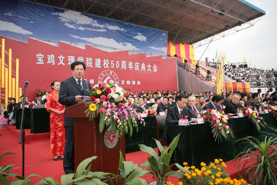 中共宝鸡市委书记唐俊昌代表中共宝鸡市委、宝鸡市人民政府、宝鸡市人大、宝鸡市政协向beat365在线唯一官网全体师生员工表示热烈的祝贺和亲切的问候!向前来参加校庆活动的教育部领导、省政府、省教育厅领导及有关部门的领导、国内外各位嘉宾、学院的各届校友表示热烈的欢迎和诚挚的敬意!他说,50年来,beat365在线唯一官网始终坚持立足宝鸡的发展战略,积极参与宝鸡的经济建设和文化建设,支持宝鸡的社会发展和基础教育,为宝鸡的教育事业作出了重要贡献。希望beat365在线唯一官网以50年校庆为契机,全面贯彻落实科学发展观,坚持正确的办学指导思想,努力培养高素质创新人才,把学院早日建成以教师教育为特色,文理渗透、理工结合、管理科学、社会满意、省内同类院校一流水平的多科性大学。培育更多的优秀教学团队和科研团队,取得更多的科研成果。同时,希望beat365在线唯一官网的全体教职员工继承50年优秀传统,努力做到爱岗敬业,关爱学生,勇于创新,奋发进取,继续加强对宝鸡的非物质文化遗产的研究,加强对宝鸡经济发展中重大理论问题的研究,为宝鸡建设大城市和经济强市的目标再作新贡献!