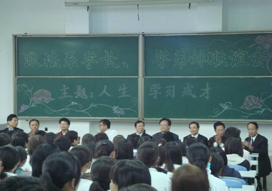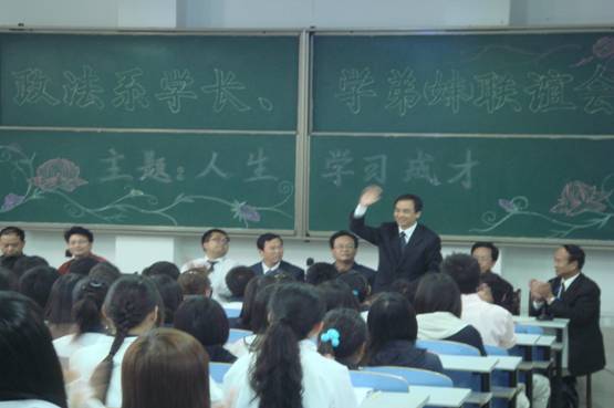 10月6日下午,思贤楼520教室座无虚席,气氛热烈,政法系新老系友互动座谈会在这里举行。78级系友、中国人民大学博士导师肖群忠,86级系友、国家林业总局驻海口专员程鹏,80级系友、蒲白矿务局副局长任广明,81级系友、广东珠海市拱北中学校长王新政,88级系友、杨凌电视台台长白宏伟,86级系友、陕西第七建筑公司三公司党委书记付强,81级系友、宝鸡德生房地产公司总经理张卫民,86级系友、宝鸡市人民检察院民事行政检察处副处长梁小科,86级系友、岐山县大营镇党委书记武建勋九位系友与政法系300余名同学互动座谈。座谈会上各位系友介绍了自己当年在校学习、生活情况,毕业后工作情况及人生感言;表达了对母校的感激、思念之情。现场回答和交流了学习、考研、理想、人生、创业等问题;对学弟学妹提出了希望和要求。参加座谈会的同学深受启发和鼓舞,决心以学长为榜样,努力学习,提高素质,奋发成才,以实际行动报答学校。