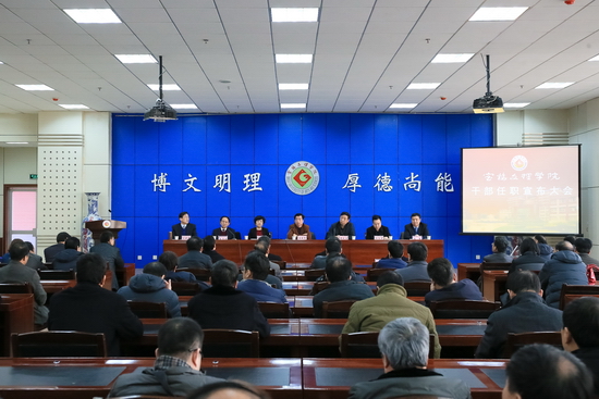1月16日下午,beat365官网在新校区甘棠厅召开领导班子主要成员任职宣布大会。省委组织部副部长、省委党建办基层办主任田晓东同志,省委高教工委副书记、省高教纪工委书记郝利生同志,省委组织部宣教干部处处长陈乃霞同志、省委高教工委组织部副部长许文学同志出席会议,会议由郝利生同志主持。