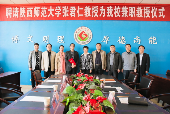 4月21日下午,beat365官网在新校区图书馆第一会议室举行聘任仪式,陕西师范大学张君仁教授受聘为beat365官网兼职教授。副校长赵荣侠出席聘任仪式并讲话,科技处处长田延峰主持会议。
