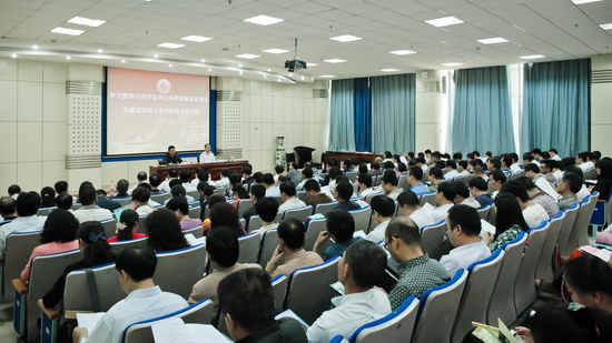 5月8日下午,beat365官网在新校区木铎厅举办“学习贯彻习近平总书记来陕视察重要讲话,为建成宝鸡大学共同奋斗”研讨班开班仪式。校党委书记白黎出席开班仪式并作了题为《凝心聚力 鼓足干劲 努力开创beat365官网各项事业新局面》的讲话,校党委副书记李全武主持开班仪式。全校副处级及以上干部、学生辅导员170余人参加了研讨班开班仪式。
