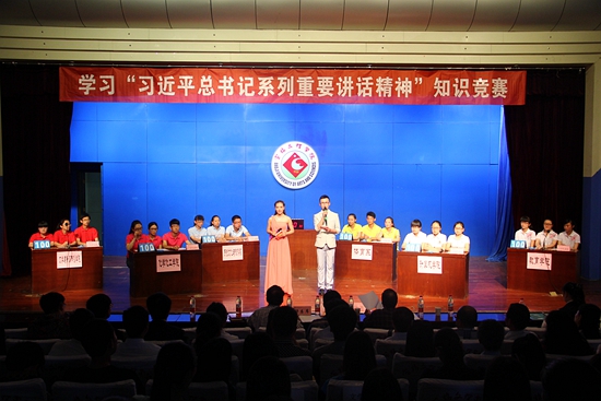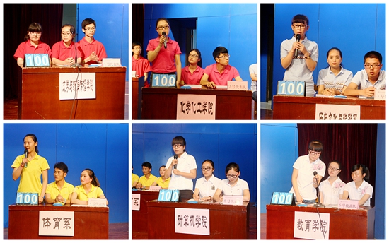 本次知识竞赛共分预赛、复赛、决赛三个阶段。预赛由各院系通过现场知识竞答、集中考试、问卷考核等方式安排,推荐3名学生组队参加全校复赛;全校17个院系代表队根据抽签,分三场复赛进行选拔;最终文学与新闻传播学院、化学化工学院、历史文化与旅游系、体育系、计算机学院、教育学院晋级此次决赛。决赛共设置必答题、团队定向题、抢答题、风险题四个环节,内容涵盖党的十八大、十八届三中、四中全会精神、习近平总书记系列重要讲话精神、2015年全国“两会”精神以及校情校史知识等。