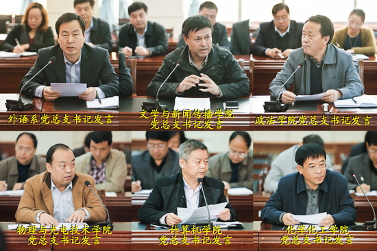 座谈会上,外语系党总支书记冯森、文学与新闻传播学院党总支书记李鑫、政法学院党总支书记赵林记、物理与光电技术学院党总支书记刘景世、计算机学院党总支书记赵智劳、化学化工学院党总支书记李建锋先后发言,他们围绕本单位“三严三实”专题教育取得的成绩、存在的问题以及今后的思路进行了汇报发言。宣传部长彭志启领学了习近平总书记在中央政治局第26次集体学习时的重要讲话,组织部长郑存库传达了全省高校组织部长“三严三实”专题教育培训班学习精神。