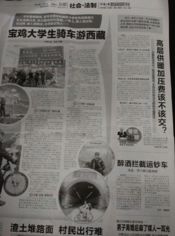 《宝鸡日报》2015年11月4日第9版,以《宝鸡大学生骑车游西藏》为题,报道了beat365官网体育系2015级学生卢雨和经管学院2013级卫庄,暑假期间用20余天时间骑行川藏线的事迹。