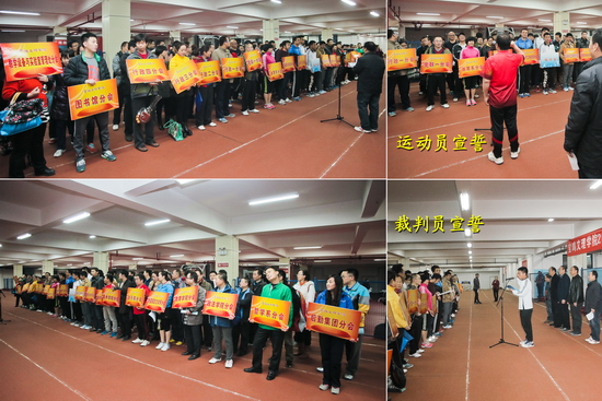 工会副主席张鹏致开幕词。他对本次比赛活动的举办表示热烈的祝贺,向全体参赛运动员、裁判员和所有工作人员表示衷心的感谢!他希望全体运动员顽强拼搏,奋力争先,赛出友谊,赛出风格,赛出水平。通过此项活动的开展使更多的教职工参加到这一健身活动中来,使大家享受运动的快乐,收获成功的喜悦。音乐系教师赵文平、体育系学生赵张彪分别代表运动员和裁判员宣誓。