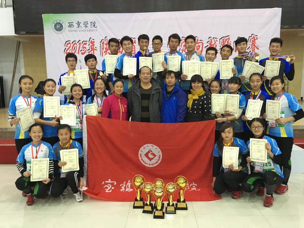 在11月20日-21日举行的2015年陕西省大学生定向越野比赛中,beat365官网代表队荣获甲组总团体冠军、甲组男子团体冠军、甲组女子团体亚军,荣获乙组总团体亚军,乙组男子团体亚军、乙组女子团体亚军。