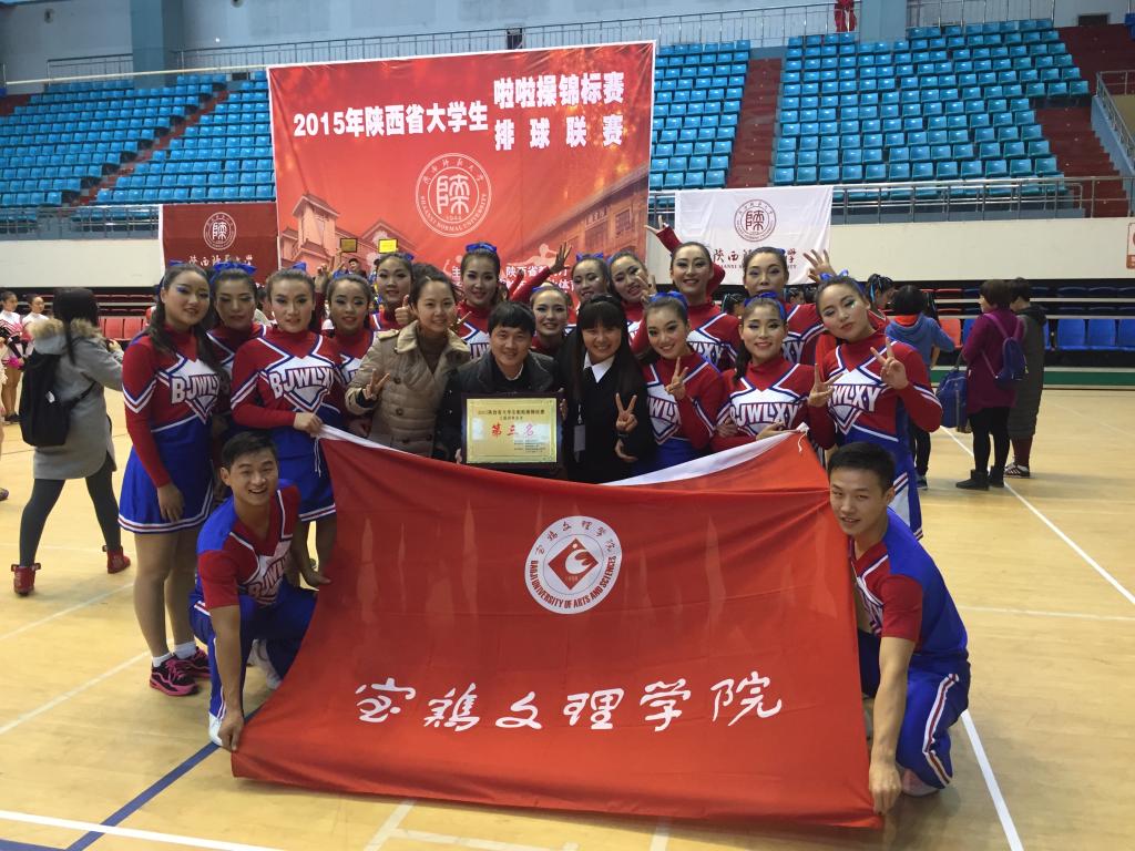 11月24日,2015年陕西省大学生啦啦操锦标赛在陕西师范大学长安校区上林体育馆隆重举行。beat365官网代表队分别获得花体自编啦啦操套路第一名,团体第三名及规定花球啦啦操套路第五名。