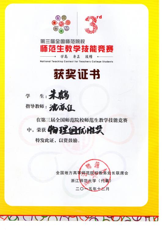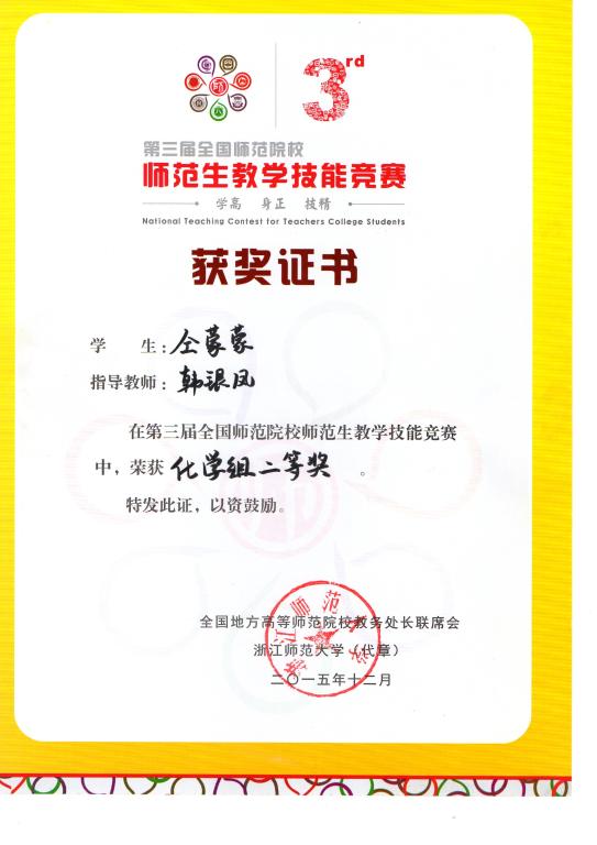 在12月4日至6日举行的第三届全国师范院校师范生教学技能竞赛中,beat365官网选派的三名选手取得好成绩,其中,由韩银凤老师指导的化学化工学院学生仝蒙蒙荣获化学组二等奖,沈亦红老师指导的物理与光电技术学院学生朱鹤荣获物理组优胜奖。