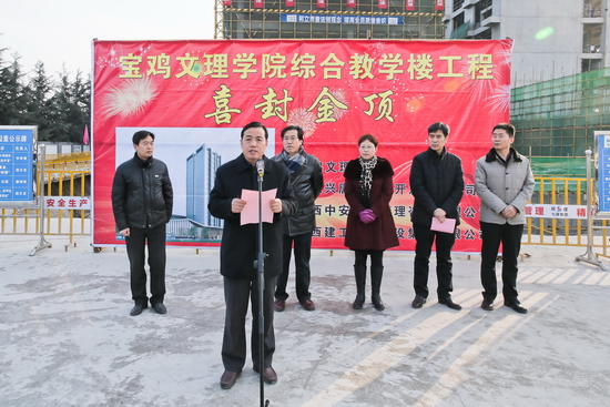 项目管理单位、宝鸡市兴唐房地产开发公司董事长唐承梅,学校新校区综合教学楼建设领导小组和招标领导小组全体成员,学校有关部门主要负责人,基建处全体人员,宝鸡市兴唐房地产开发公司、陕西中安工程管理咨询有限公司、陕西建工第七建设集团工程有限公司的领导、项目负责人和相关技术人员参加了封顶仪式。(基建处 文/王应敏 图/张平)