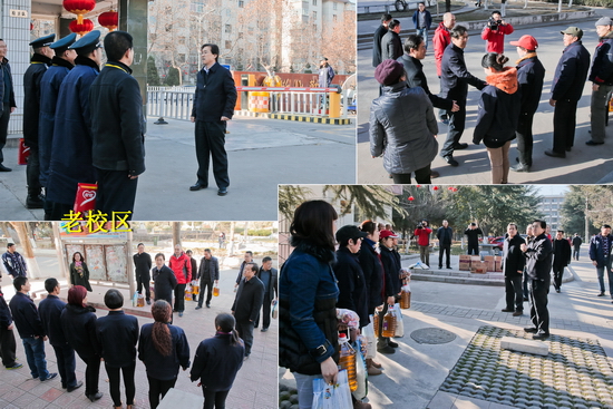 校领导一行先后走访慰问了新、老校区保卫处、物业管理中心、饮食服务中心、学生社区管理中心等部门的工作人员。每到一处,校领导都热情地与各部门值班人员一一握手,向他们送去新年的祝福和春节慰问品。司晓宏代表学校党政向在春节期间坚守岗位、辛勤工作教职工表示衷心感谢,并祝愿他们新春快乐!