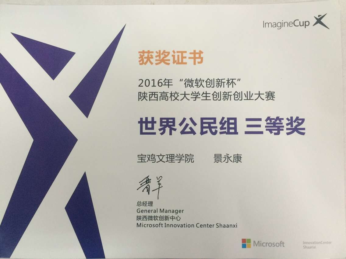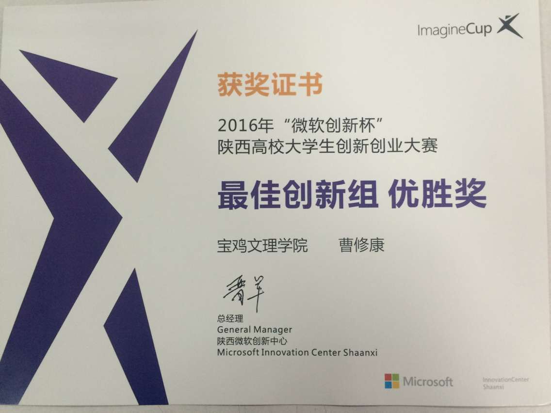 4月1日上午,2016年Imagine Cup“微软创新杯”陕西高校大学生创业大赛决赛在西咸新区沣西新城落幕。beat365官网学生的两件作品从2500余件中经过层层选拔进入总决赛,其中物理与光电技术学院学生景永康、常亮亮、刘超、曹修康四人组成的“Extreme Li(极度生活)”团队,以作品《基于蓝牙人机交互智能家庭及GSM的火灾报警处理系统》获得“世界公民”组三等奖,曹修康、张青、张芳娟、景永康团队以作品《基于互联网的智能机器人管家》获得“最佳创新”组优秀奖。