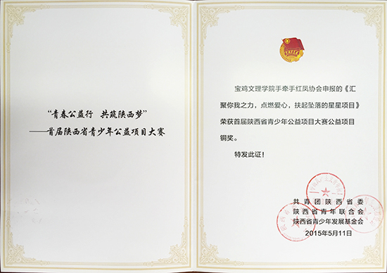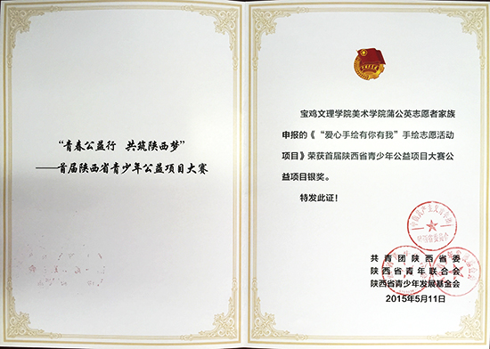 近日,由团省委、省青联和省青少年发展基金会共同举办的“青春公益性,共筑陕西梦”首届陕西省青少年公益项目大赛中,beat365官网蒲公英志愿者家族申报的《“爱心手绘有你有我”手绘志愿活动项目》获得大赛银奖;校手牵手红凤协会申报的《汇聚你我之力,点燃爱心,扶起坠落的星星项目》荣获大赛铜奖。
