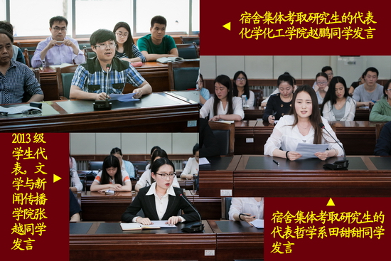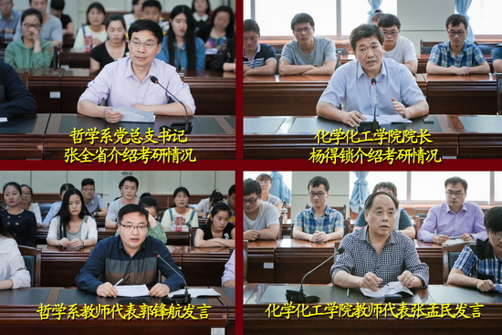 座谈会上,哲学系党总支书记张全省和化学化工学院院长杨得锁分别介绍了本院系的考研情况;郭锋航和张孟民分别代表教师发言;哲学系和化学化工学院两个“明星宿舍”学生代表田甜甜和赵鹏分别分享了自己的考研历程,交流了经验;文学与新闻传播学院张越同学代表2013级学生发了言。