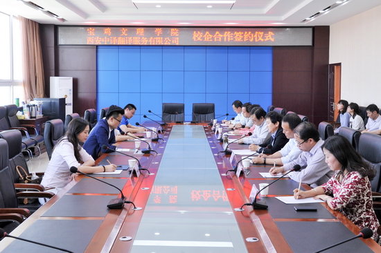 西安中译翻译服务有限公司副总经理党新、陕西秦言佐信息技术有限公司市场部经理鹿鸣、科技处副处长王晓玲、教务处副处长俱国鹏、外国语言文学系副主任李伟、翻译教研室主任耿秀萍、语言实验室主任蒋志刚等参加了会议。(科技处、外国语言文学系 文/龙涛 图/钟磊)