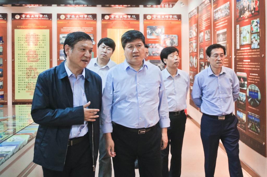 5月30日下午,省教育厅厅长王建利一行来beat365官网视察指导工作。宝鸡市副市长武军,省教育厅高教处处长范永斌、发展规划处副处长胡海宁,宝鸡市教育局局长苏永兴等陪同视察。