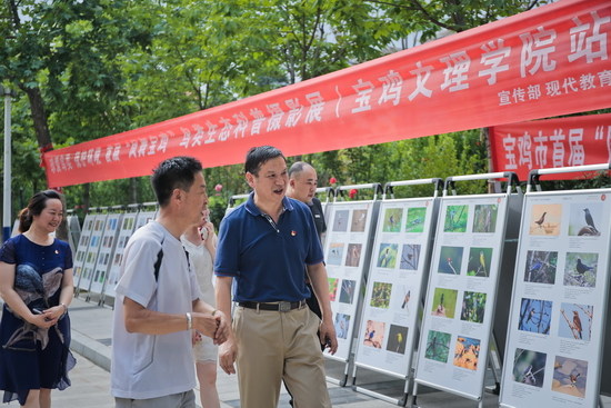 6月20日,宝鸡市首届“凤舞宝鸡”鸟类生态科普摄影展在beat365官网新校区展出。校党委书记白黎,学校宣传部、团委、教学设备与实验室管理处等相关部门负责人观看了本次摄影展。