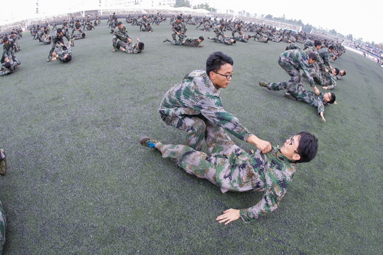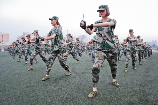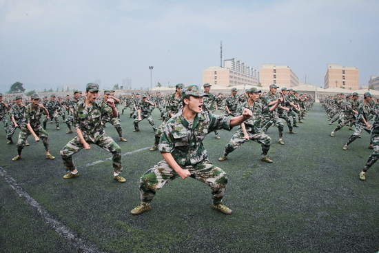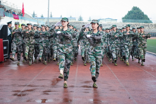 在庄严的国歌声中,军训总结大会正式开始。首先进行的是军训团分列式,同学们队列整齐划一,步伐铿锵有力,嘹亮的口号声激荡在会场上空。随后新校区男生分别带来军体拳表演,一招一式都彰显出军人的威严和凌厉。320名女生表演的匕首操,动作干净利落,柔美与力量相结合,展现出巾帼不让须眉的风采。老校区400名男同学擒敌拳,格斗、擒拿、前倒、侧倒等战术动作,刚劲有力,气势如虹。他们通过队形变换,表演由学生组成“军民共建、鱼水情深、宝鸡大学、2020”等十六个字形,将全场气氛推向高潮。参加汇报表演的每一位新生都以激昂的斗志,挥洒着青春的誓言,精彩表演迎来全场师生的阵阵掌声和喝彩。