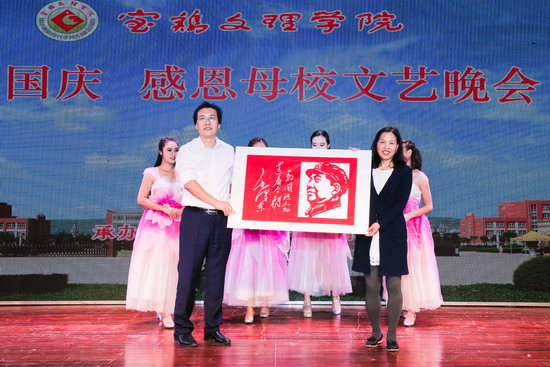 beat365官网外语系88级校友雪彩娟现场表演剪纸技艺,剪出一副毛主席侧面头像和一首毛主席诗词,并将剪纸作品赠送给了母校,表达了校友对母校未来发展的美好祝福,也作为对祖国母亲67华诞的祝福;诗朗诵《真爱缱绻》赞扬了以陕西联兴房地产开发公司董事长徐洲成为代表的优秀校友为母校发展做出的积极贡献,激励着我们向榜样学习;歌曲《我爱你中国》、歌伴舞《好儿好女好江山》表达了文理学子对祖国母亲的真诚祝福与无限热爱;晚会在歌伴舞《梦想的旗帜》催人奋进的旋律中落下帷幕。