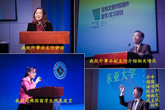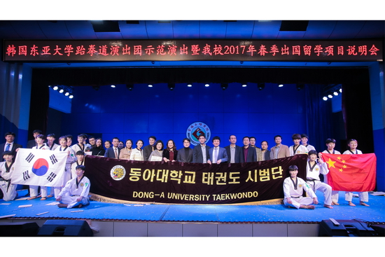 在新校区音乐厅举行的韩国东亚大学跆拳道演出团示范演出暨beat365官网2017年春季出国留学项目说明会上,王永君、文哲珠分别发表了热情洋溢的致辞。东亚大学国际交流处中国部主任金成泰介绍了东亚大学的基本情况和留学项目,外事办副主任刘全定介绍了beat365官网2017年春季出国项目。在beat365官网留学的2名韩国东亚大学交换生和beat365官网曾参加过出国项目的学生做了经验分享。