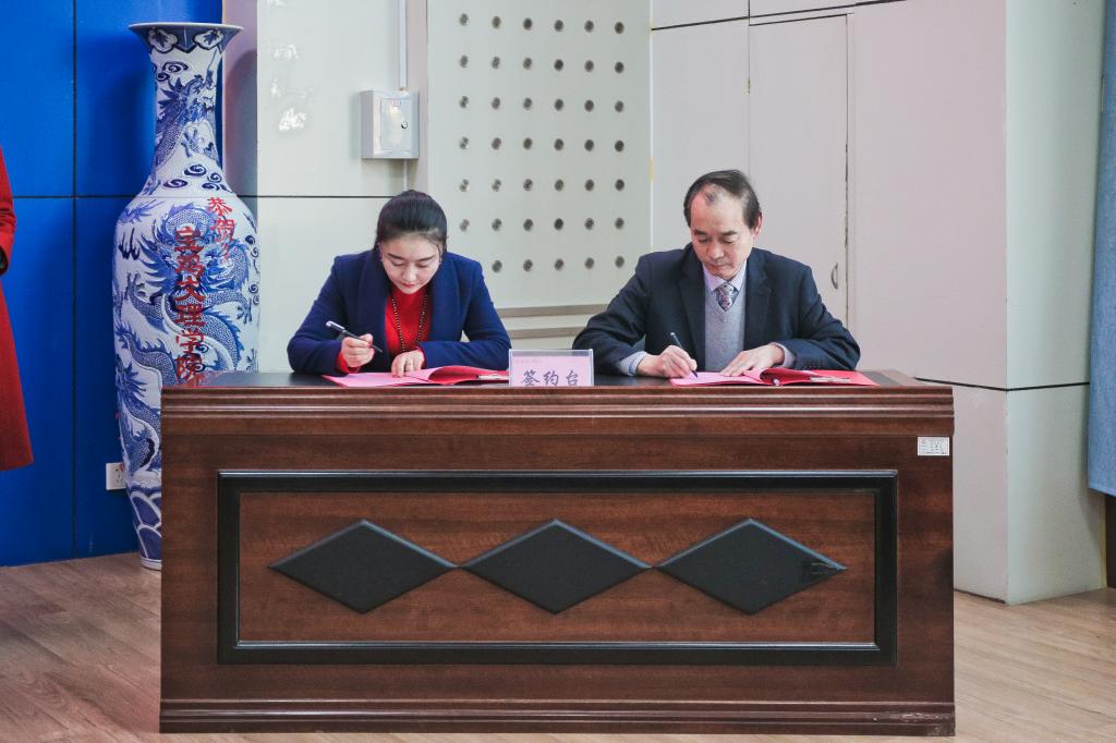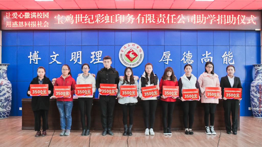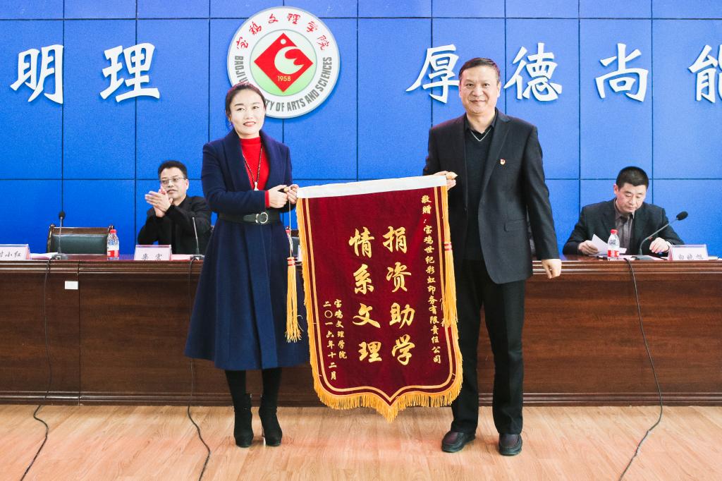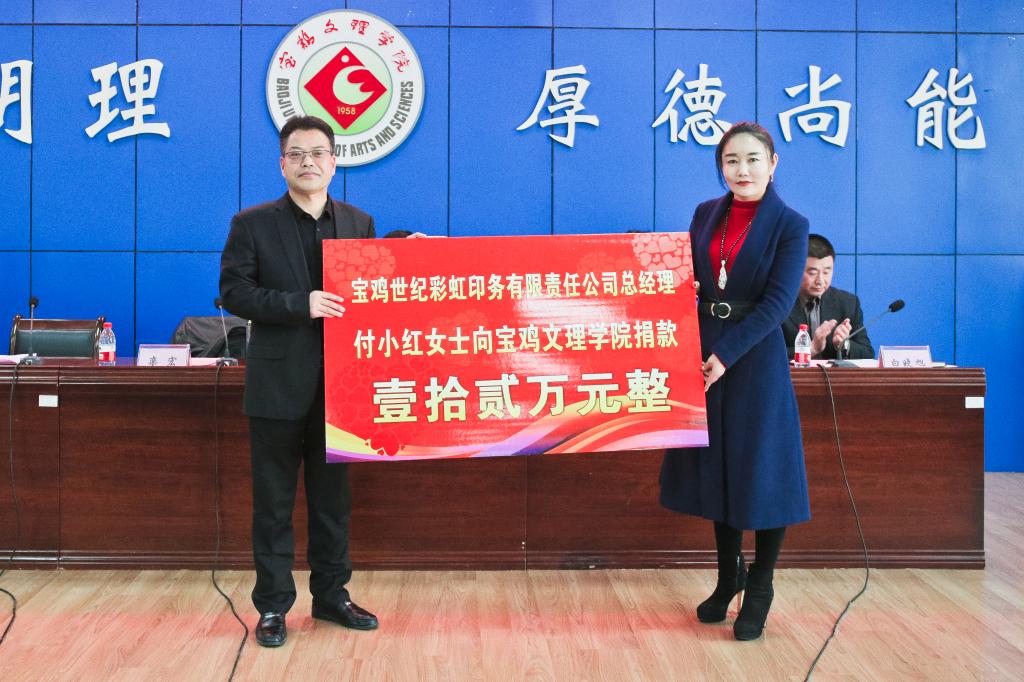 仪式上,白黎为宝鸡世纪彩虹印务有限责任公司赠送锦旗,栾宏接受了捐赠支票牌,李周让代表学校与付小红总经理签订了《捐款协议书》,白晓旭宣读了受助学生名单。