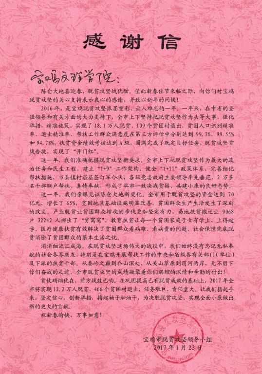 陈仓大地喜迎春,脱贫攻坚战犹酣。值此新春佳节来临之际,向你们对宝鸡脱贫攻坚的关心支持表示衷心的感谢,并致以新年的问候!