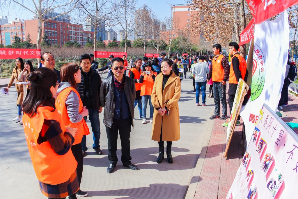 校党委副书记栾宏莅临现场,仔细观看了各院系制作的学习雷锋宣传板,详细了解各单位学雷锋志愿服务活动的具体情况,并与广大志愿者亲切交谈。他强调青年学生要结合时代内涵弘扬雷锋精神:一要弘扬雷锋钉子精神,运用攻坚克难的新力量;二要弘扬雷锋奉献精神,树立无私奉献的新旗帜;三要弘扬雷锋创新精神,倡导创新发展新风尚。