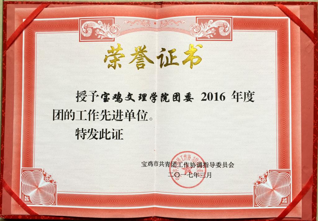 近日,在团市委召开的共青团宝鸡市委第十二届六次全体(扩大)会议上传来喜讯,校团委荣获2016年度团的工作先进单位荣誉称号。(校团委 文、图/张磊)