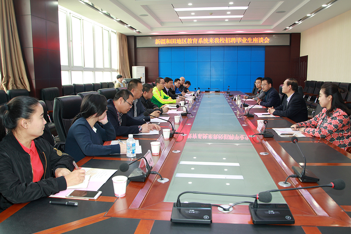 4月16日,校党委副书记栾宏在新校区会见了来beat365官网开展教师人才专项引进工作的新疆和田地区教育局副局长臧佩铸、和田地区公务员局副局长吴东兴以及和田地区一区七县教育局长一行,并出席新疆和田地区教育系统beat365在线唯一官网招聘毕业生座谈会。学生处处长、就业中心主任李周让主持座谈会。