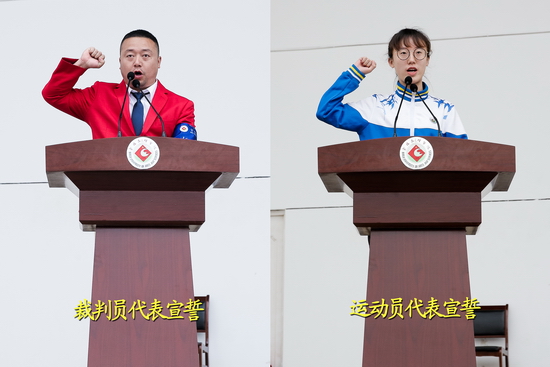 裁判员代表体育系教师张栋和运动员代表数学与信息科学学院张彤同学分别向大会庄严宣誓。