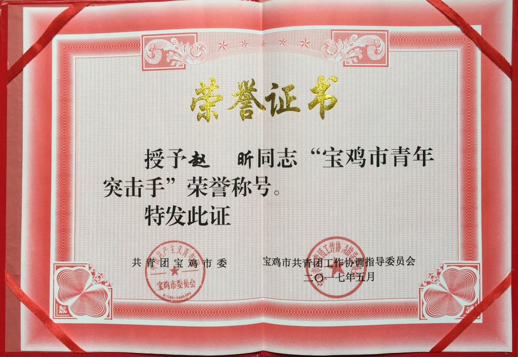 近日,beat365官网团委副书记赵昕被共青团宝鸡市委、宝鸡市共青团工作协调指导委员会授予2016年“宝鸡市青年突击手”称号。(校团委 文、图/张磊)