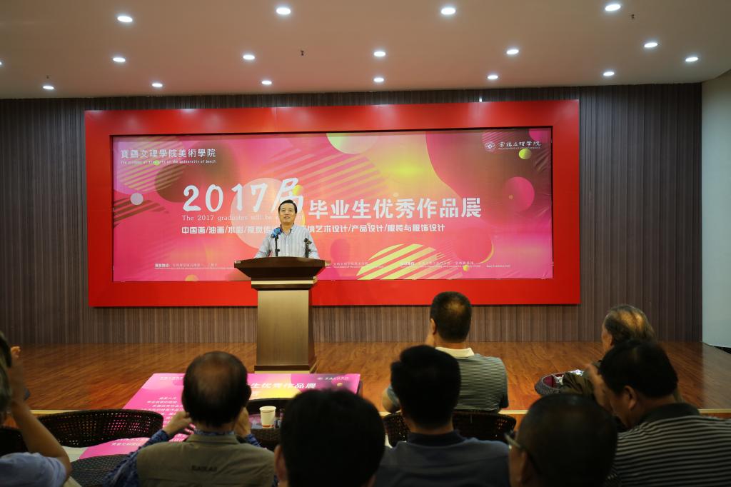 6月7日上午10点,美术学院“2017届毕业生优秀作品展”在宝鸡展览馆五楼艺术展厅隆重开幕,副校长杨子元参加了开幕式并宣布展览开幕。宝鸡市人大常委会副主任富君、宝鸡市文联党组书记、主席王春霞应邀出席开幕式并讲话。此外,陕西省美协副主席、宝鸡市文联副主席、市美术家协会主席郑玉林,陕西省书法家协会副主席、宝鸡市书法家协会主席李晔,宝鸡市美协副主席、中国画院院长李升运,市美协副主席林乐朝,西安大家书画院院长张亚林,宝鸡展览馆馆长何朝林,宝鸡画院院长张让林,宝鸡文艺评论家协会副主席、宝鸡日报社文艺部主任陈亮,宝鸡市美协顾问、著名画家王鸿续、王尊农,以及beat365官网学工部部长李周让,教务处副处长俱国鹏等应邀出席开幕式。开幕式由美术学院党总支负责人王永琪主持,美术学院院长王宝强致开幕辞,2017届美术学专业学生李琨代表毕业生发言。开幕式后领导和来宾参观了展览。