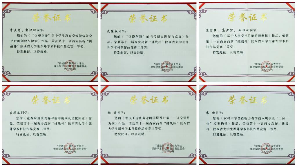 近日,在由共青团陕西省委、陕西省科技厅、陕西省教育厅、陕西省学联、西安高新区管委会、陕西省科学院、陕西省社会科学院共同主办、西安邮电大学承办的第十一届西安高新“挑战杯”陕西省大学生课外学术科技作品竞赛中,beat365官网选送的教育学院李孟菲、郭环环同学的作品《“守望花开”留守学生教育交流微信公众平台的创建与探索》荣获一等奖;电气学院高宏旺、高少宏、刘洋栋同学的作品《基于人际交互的激光雕刻机》,历史系李胜琴同学的作品《论西府地区丧葬习俗中的周礼文化因素》,哲学系史佳威同学的作品《“休谟问题”的当代研究进展与意义》荣获二等奖;哲学系杨丽同学的作品《农民工返乡养老的困境及对策——以宁强县为例》,外语系宋欢同学的作品《农村中学英语听力教学投入现状及“三位一体”模型构建》荣获三等奖。(校团委 文、图/张磊)