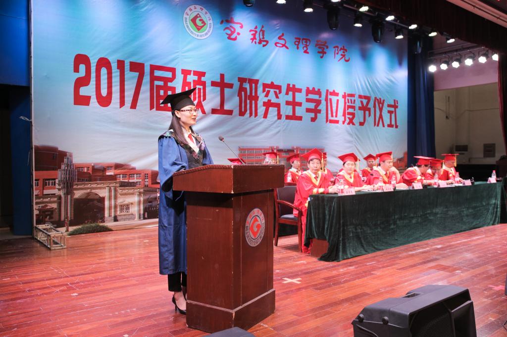 文学与新闻传播学院赵德利教授代表全体导师对圆满完成学业的2017届硕士研究生表示衷心祝贺,希望毕业生在步入社会之际要以自己是宝文理的一员而感到骄傲和自豪。2017届硕士研究生、地理与环境学院潘蓉同学代表全体毕业生向辛勤培育他们的学校领导和老师表示最衷心的感谢和最崇高的敬意,并祝愿母校早日实现建成宝鸡大学的宏伟目标!